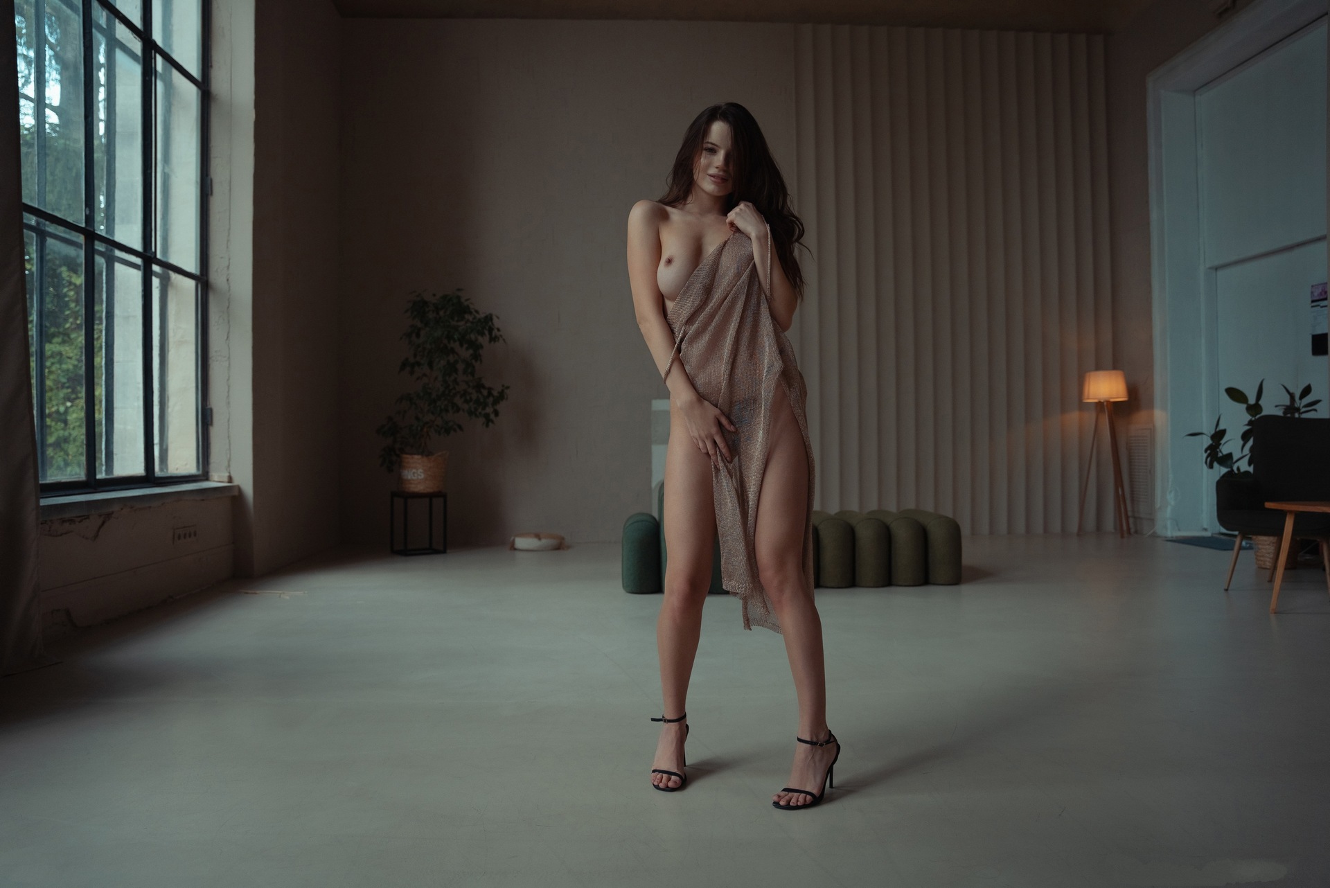 Пикантное шоу со стриптизом в большом, затемненном офисе.